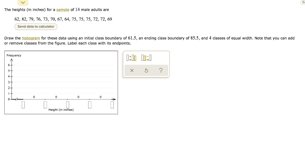 Solved The Heights In Inches For Sample Of 14 Male Adults Are 62 82 79 76 73 70 67 64 75 75 75 72 72 69 Send Data T0 Calculator
